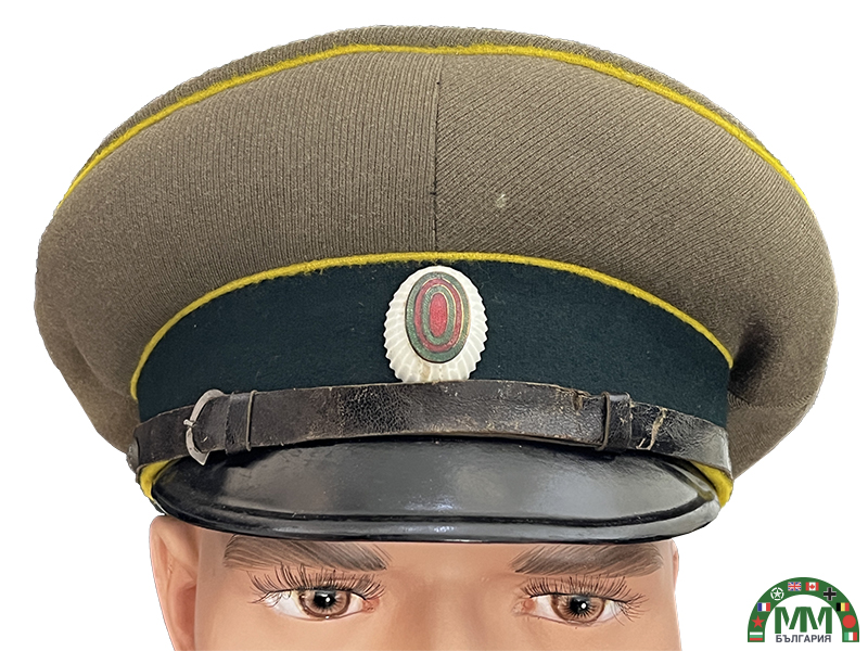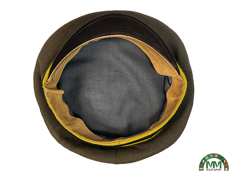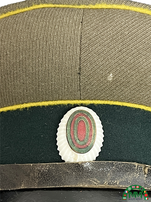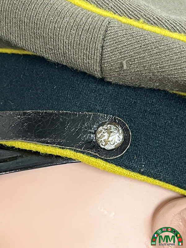 La visière en fibre laquée, à intérieur noir, ainsi que la jugulaire en cuir noir, évoquent les modèles destinés aux officiers ou sous-officiers supérieurs. Ces éléments témoignent de l’évolution de l’uniformologie bulgare vers des standards proches de ceux de la Wehrmacht tout en conservant les couleurs propres aux armes bulgares.