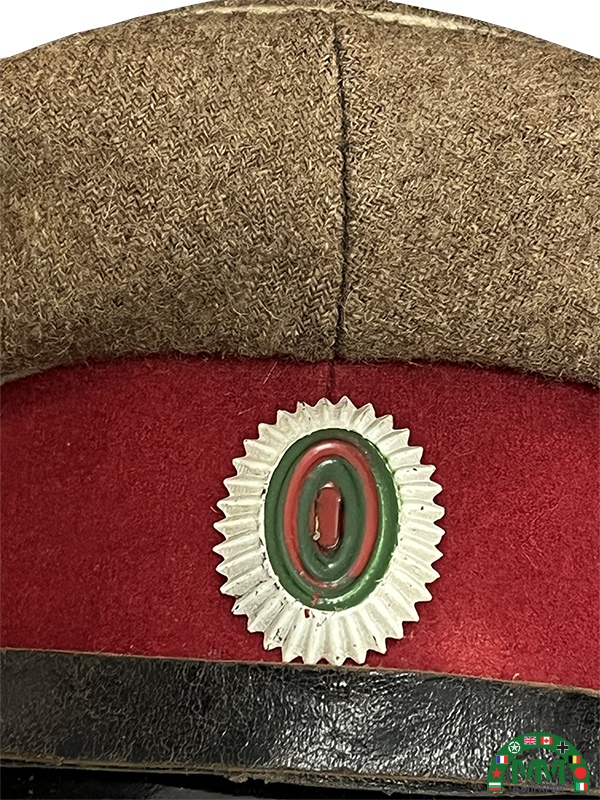 Casquette d’officier bulgare de la cavalerie, modèle 1910/1915, composée d’une bombe en drap brun-olive, d’un large bandeau frontal en drap rouge et d’un passepoil blanc soulignant les contours supérieurs et inférieurs. La visière est en fibre laquée noire et la jugulaire, en cuir noir, est maintenue par deux petits boutons métalliques représentant le lion héraldique couronné du royaume de Bulgarie.