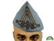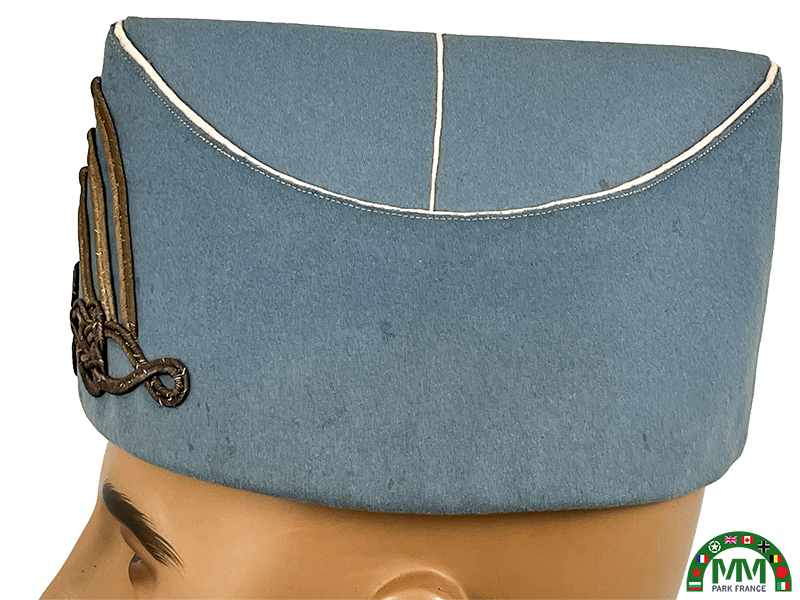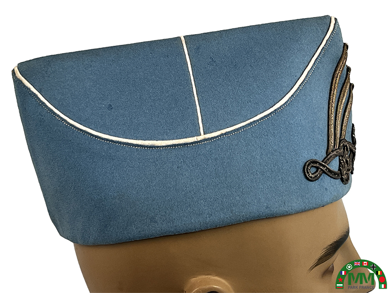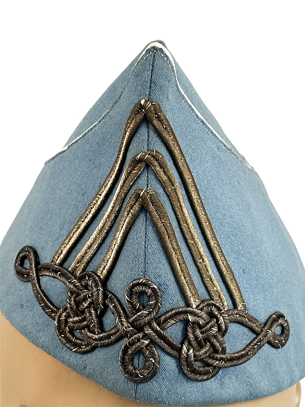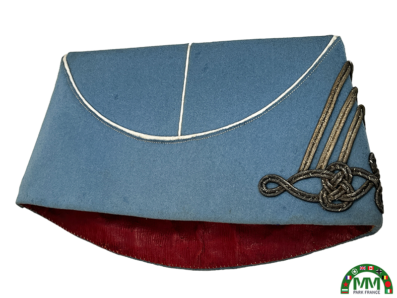 Bonnet de police asymétrique en drap bleu horizon, à passepoils blancs. Le devant est orné du nœud hongrois en cannetille argentée surmonté de trois galons disposés en chevrons, indiquant le grade de capitaine.