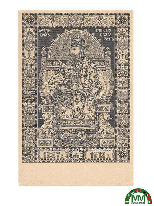 Carte postale commémorative bulgare représentant Ferdinand Ier, “Tsar des Bulgares”, assis sur un trône, dans un encadrement décoratif inspiré de motifs médiévaux. En bas, les dates 1887–1912 indiquent le 25e anniversaire de l’accession de Ferdinand au trône (jubilé de règne).