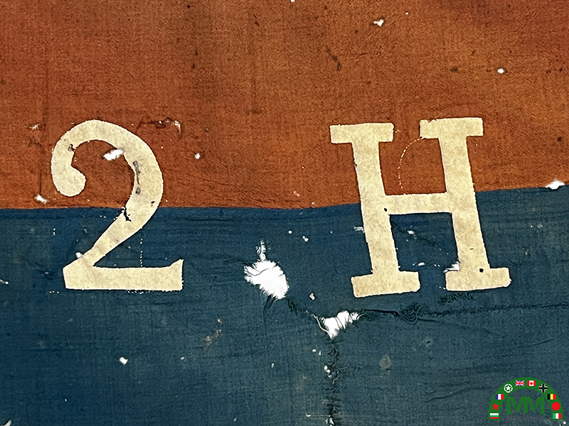 Analyse du tissu et de la fabrication ; le revers montre une absence totale de doublure, typique des fanions de service contrairement aux fanions d’apparat brodés. Des coutures simples, non décorées, avec fil clair sont cohérentes avec une fabrication régimentaire (ateliers internes). Des déchirures, usure naturelle par frottement d’un textile militaire ancien.Cela correspond parfaitement aux fanions utilisés par les officiers montés dans les années 1900–1940, notamment dans la cavalerie légère (dont les Hussards). Les couleurs observées bleu passé et brun rougeâtre, très parasitées par vieillissement et poussière sont exactement les teintes du 2e RH. Cette combinaison n’existe dans aucun autre régiment français. L’attribution au 2áµÂ‰ Régiment de Hussards est.confirmée à 100 %. Les lettres "H" et "2" montrent une usure identique à celle du tissu. Le marquage très simple avec une typographie "bâton" est typique de l'entre-deux-guerres