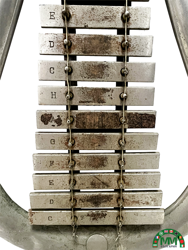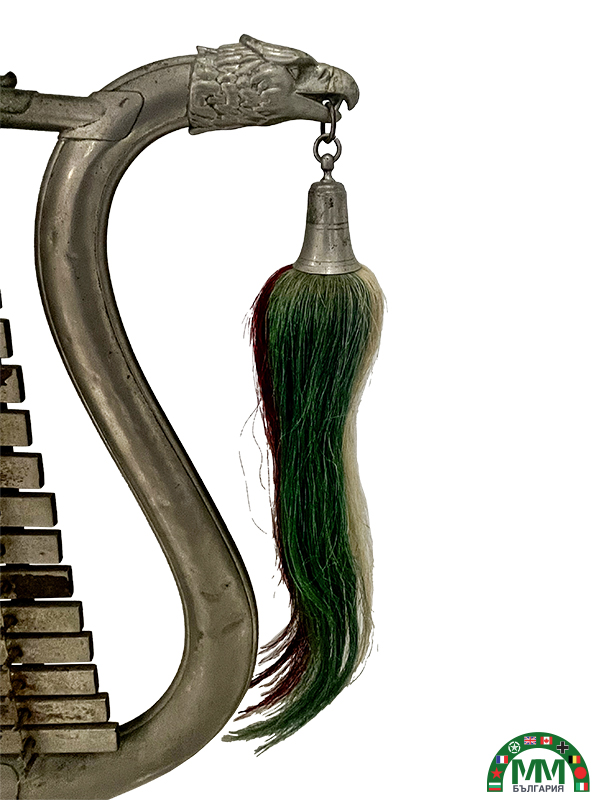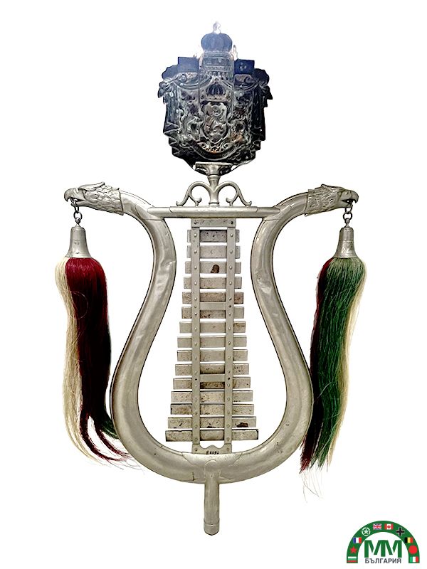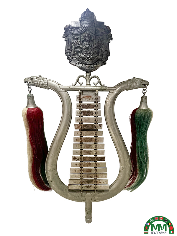 Instrument en métal argenté composé d’une armature en forme de lyre, d’un ensemble de lames métalliques accordées, marquées par lettres de notes ( E, D, C, H, A, G, F, …), de glands latéraux en crin tricolore bulgare (blanc, vert, rouge), d’un écu supérieur aux grandes armes royales bulgares (couronne, lion héraldique, lions supports, manteau royal).