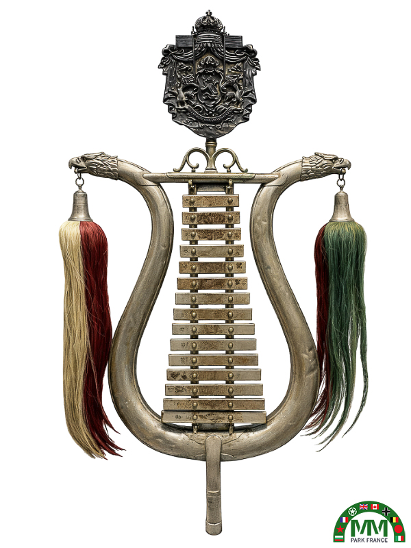Instrument utilisé dans les musiques militaires pour les défilés, les cérémonies officielles, les prises d’armes, les manifestations royales ou d’État. Le Lyra-Glockenspiel est porté et joué à l’aide de baguettes, produisant un son clair de carillon.