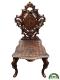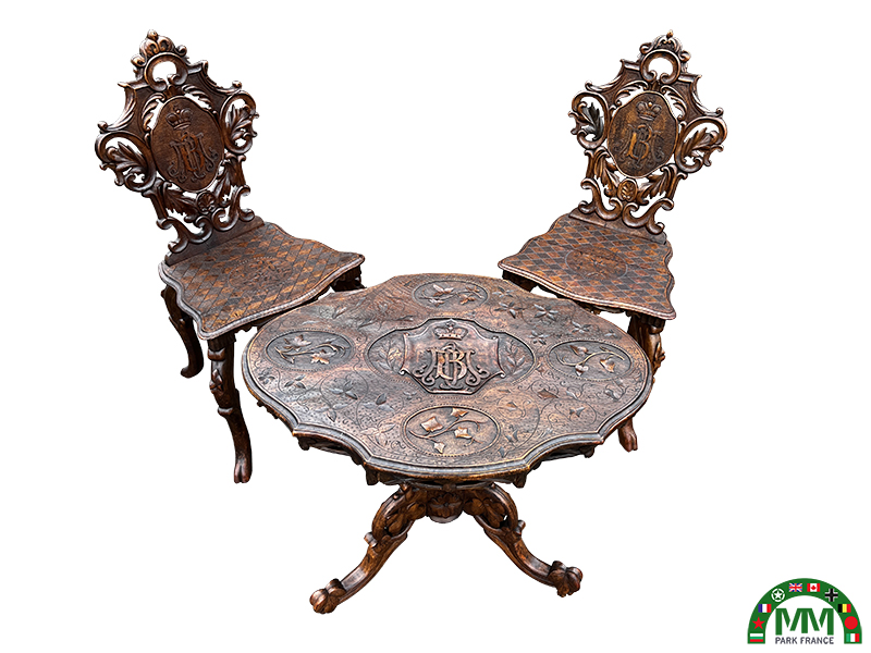 Analyse stylistique et iconographique. Style : historiciste, avec des emprunts au néo-Renaissance et au néo-baroque, courant dans les arts décoratifs d’Europe centrale à la fin du XIX siècle. Ornementation : motifs floraux et végétaux gravés, volutes et arabesques finement travaillés, témoignant d’un savoir-faire artisanal élevé. Monogramme : le chiffre « A I » entrelacé sous couronne indique un usage princier ou officiel. Fonction : table d’appoint ou guéridon de réception, accompagné de sièges aux dossiers assortis, probablement destinés à un salon de réception ou à un cabinet privé.