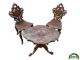 Cet ensemble de mobilier se compose d’un guéridon ovale sculpté et de deux chaises assorties, richement ornés de décors végétaux et d’un monogramme princier couronné central. L’ensemble est entièrement réalisé en bois finement sculpté, avec un plateau de guéridon décoré de motifs gravés et incrustés évoquant l’écorce, les feuilles et les arabesques florales, dans un style historiciste très raffiné, caractéristique de la seconde moitié du XIX siècle. Le monogramme principal est composé des lettres A I entremêlées, sous une couronne princière, symbolisant Alexandre Ier de Battenberg, premier prince de Bulgarie (règne 1879–1886). Ce chiffre princier, gravé en position centrale sur le plateau, indique à la fois l’appartenance de l’objet à une personnalité de haut rang et sa fonction potentiellement officielle ou diplomatique.