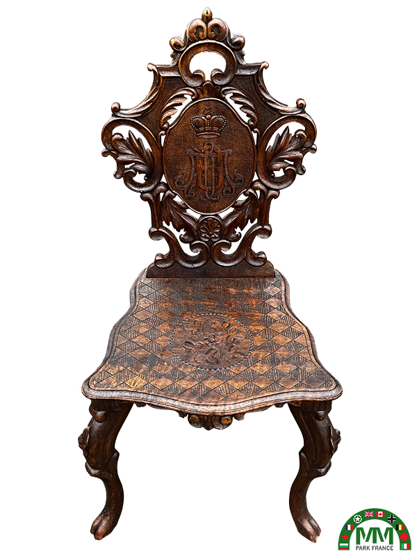 Contexte historique. Alexandre de Battenberg (1857–1893) fut le premier prince (kniaz) de Bulgarie après la libération du pays du joug ottoman, élu en 1879. Bien que son règne soit relativement court, il entretint des liens étroits avec les cours européennes, notamment austro-hongroise et germaniques, ce qui explique la provenance probable des ateliers ou de la commande. Les éléments décoratifs et la qualité d’exécution suggèrent une production destinée à une maison princière ou à un décor officiel, témoignant du rayonnement culturel et diplomatique de l’époque. État de conservation. L’ensemble est en excellent état de conservation, avec une patine homogène du bois et des éléments incrustés. Les sculptures et gravures restent très lisibles, et le monogramme princier est exempt de restaurations altérant son intégrité visuelle.