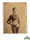 Photographie sépia en pied d’un militaire de la Garde royale bulgare en grande tenue à brandebourgs. Tirage de studio sur carton, vers 1890. Signature/annotation manuscrite sur l’image, usures du support.