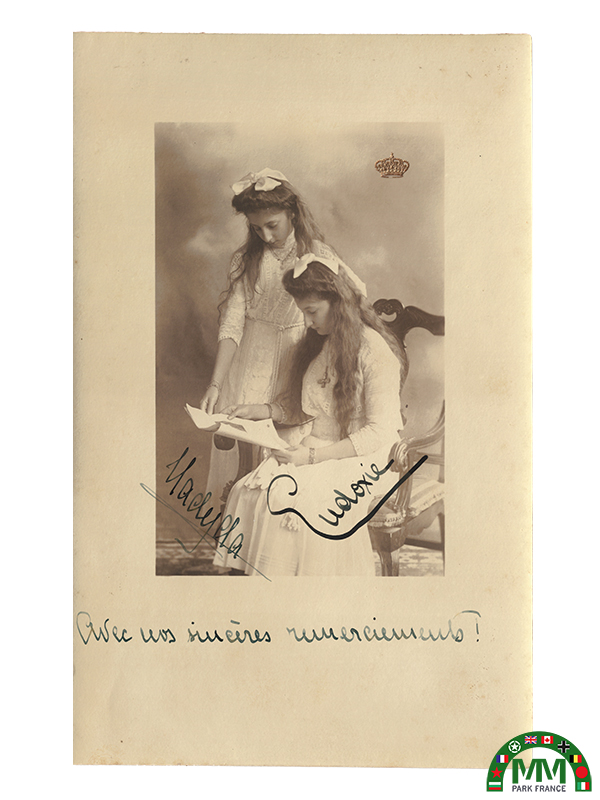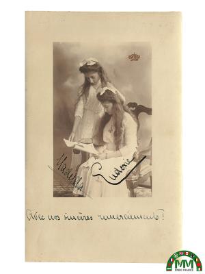 Les deux jeunes princesses sont vêtues de robes blanches, dans un style caractéristique de la fin du XIXe – début du XXe siècle. L’une, assise sur un fauteuil, lit ou examine un document tandis que l’autre, debout à ses côtés, se penche avec attention. Leur attitude évoque un moment de calme et de complicité. La composition est soignée, avec un fond neutre typique des ateliers photographiques de l’époque. Une couronne imprimée apparaît dans l’image, soulignant leur rang princier. La photographie est dédicacée et signée par les deux princesses, avec l’inscription manuscrite :