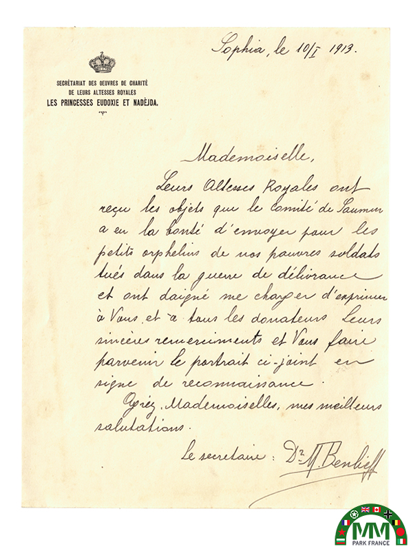 Ce document est très intéressant, car il s’inscrit dans un moment clé de l’histoire des Balkans et de la Bulgarie. La lettre est datée du 10 janvier 1913, en pleine période des guerres balkaniques (1912–1913). L’expression utilisée dans la lettre — « guerre de délivrance » — désigne ici la Première guerre balkanique (1912-1913). La Bulgarie, avec la Serbie, la Grèce et le Monténégro, combat l’Empire ottoman. L’objectif : libérer les territoires encore sous domination ottomane, notamment en Macédoine et en Thrace. Pour les Bulgares, c’est une guerre nationale et patriotique → d’où le terme “délivrance”. Les deux jeunes filles visibles sur la photo sont : Eudoxie de Bulgarie (1898–1985) Nadèjda de Bulgarie (1899–1958). Elles sont les filles du roi Ferdinand Ier de Bulgarie. À la date de la lettre, elles sont encore adolescentes (environ 14–15 ans). La lettre provient du « Secrétariat des œuvres de charité de Leurs Altesses Royales » Cela montre que les princesses participaient à des actions caritatives officielles. Elles étaient mises en avant comme figures de solidarité nationale. Leur rôle pendant la guerre : aide aux orphelins de soldats