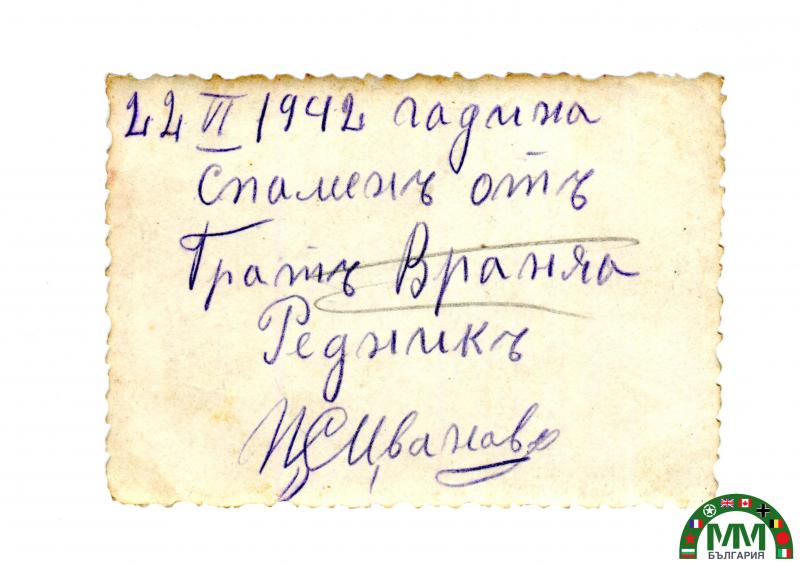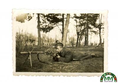 Cette photographie argentique sur papier montre un soldat de l’armée bulgare en position de tir couché, utilisant un fusil-mitrailleur Madsen monté sur bipied. Le soldat porte l’uniforme de campagne bulgare de la Seconde Guerre mondiale, composé d’une tunique sombre et d’une casquette militaire à visière. L’arme est tenue en position de tir, équipé d’un bipied avant permettant le tir stabilisé depuis le sol. Une sangle d’arme est également visible sous le boîtier. La scène se déroule en extérieur, dans un environnement boisé ou de terrain d’entraînement. Le fusil-mitrailleur Madsen, conçu au Danemark à la fin du XIX? siècle, est l’un des premiers fusils-mitrailleurs légers utilisés par de nombreuses armées à travers le monde. L’armée bulgare a utilisé cette arme pendant les guerres balkaniques, la Première Guerre mondiale et encore au début de la Seconde Guerre mondiale. Cette photographie de 1942 montre l’utilisation tardive de cette arme dans l’armée bulgare, probablement dans un cadre d’instruction ou d’entraînement militaire.