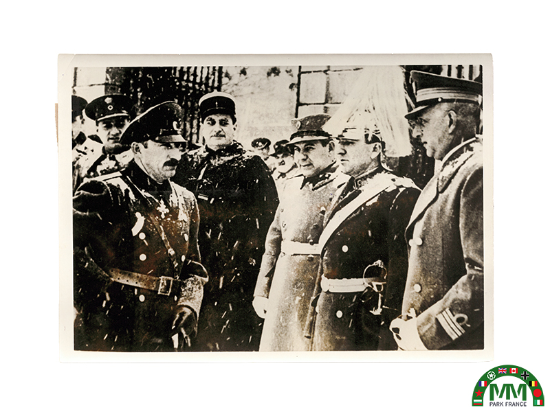 Le roi Boris III de Bulgarie rencontrant des attachés militaires étrangers à Sofia lors d’une cérémonie officielle hivernale. On distingue notamment l’attaché militaire français et l’attaché militaire italien.