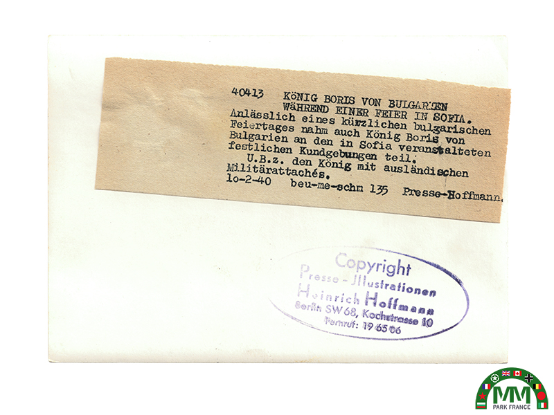 Presse-Hoffmann : renvoie très probablement à l’agence de Heinrich Hoffmann, photographe officiel du régime nazi. Cette agence diffusait des images des pays alliés ou proches de l’Allemagne, des cérémonies officielles. En 1940, la Bulgarie est diplomatiquement proche du Reich. Les cérémonies royales de Boris III étaient donc couvertes et diffusées en Allemagne.