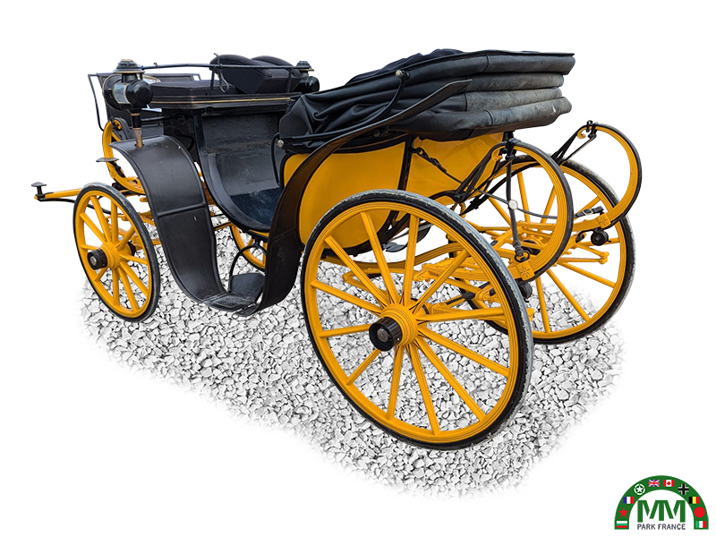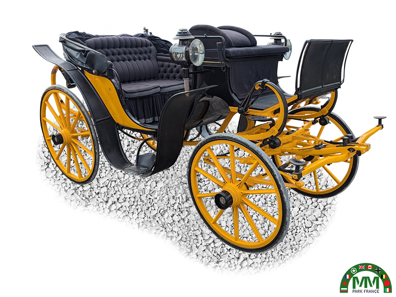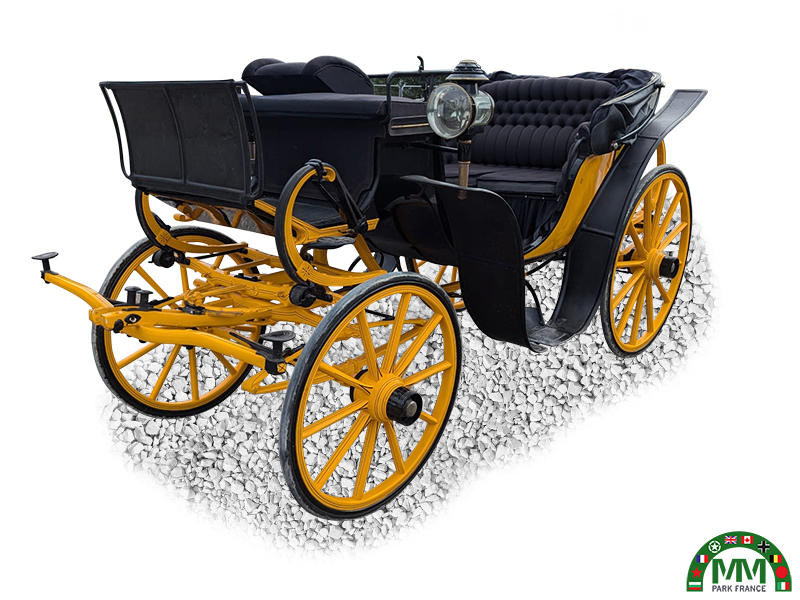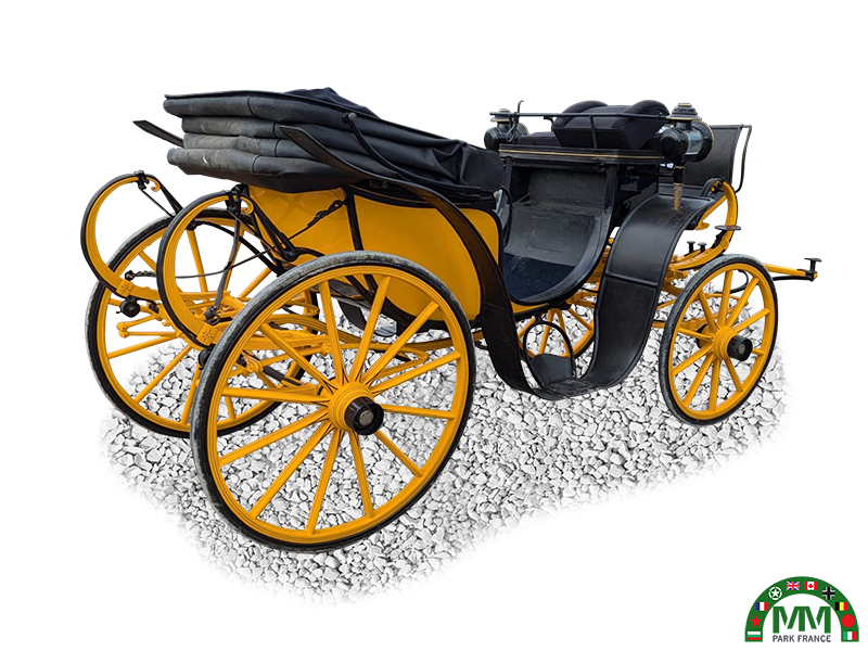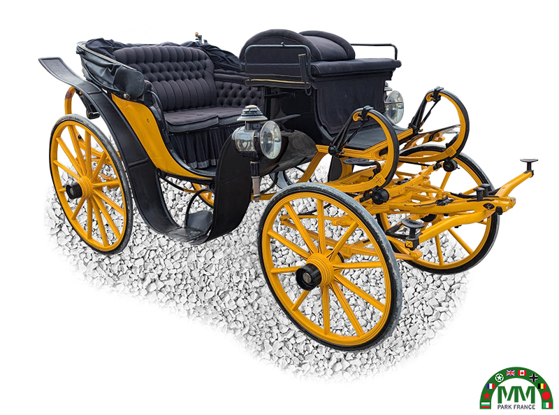 Calèche type Victoria à 2 chevaux, 8 ressorts et 4 roues caoutchoutées.